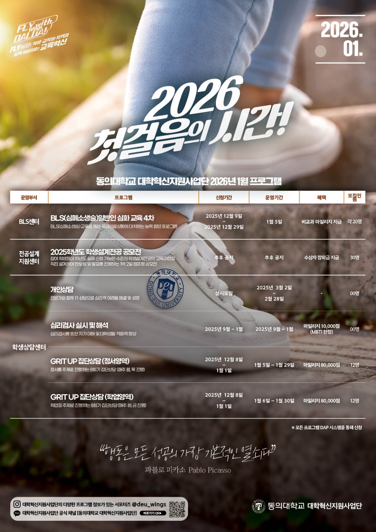 1. 2026학년도 대학혁신지원사업단에서는 성과 확산 및 공유를 위한 혁신사업 참여 콘테스트를 운영하고자 이에 따른 월간 프로그램(1월) 운영 계획표를 안내드립니다.