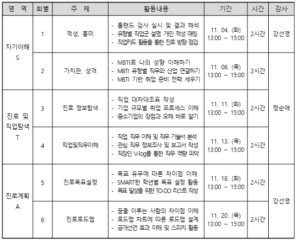 2. 주 제 : 자기이해(S), 진로 및 직업탐색(T), 진로계획(A) 역량 요소별 특강